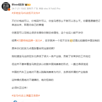 【不打价格战可以,价格回升可以,收割中国消费者不可以】汽车大V艹老师发文:不打价格战可以,价格回升可以,你宝马想怎么干就可以怎么干。你要是愿意把订单送出来,那是你自己的事情。你甚至可以花钱让很多车媒给你鼓吹合理性,这个也没人能干涉你。结果只要传统品牌一发力,反手就来一个拒不交车,还是比较藐视中国法制的。原来你们的发力点是踩着合同当废纸啊?我知道宝马当然在东北养活了很大一条产业链,贡献了非常多的工作岗位。但这并不意味着宝马就应该以收割中国消费者的形式,一直过得很滋润。中国的汽车工业绝对不是以践踏消费者为代价,去养活所谓的产业链条。